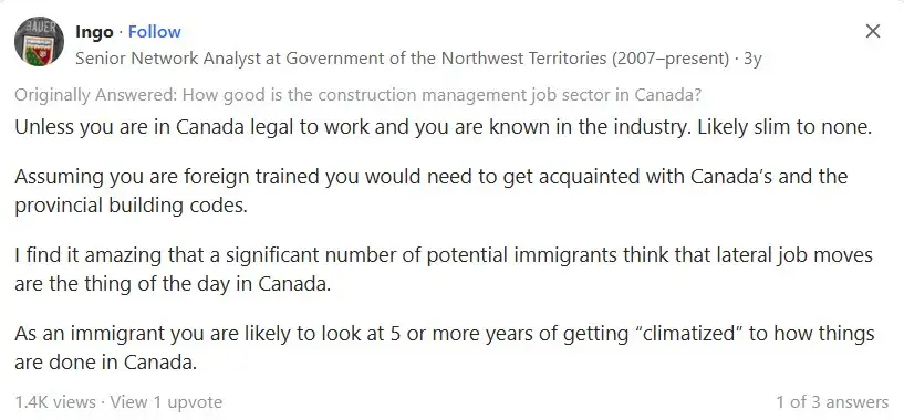 فردی به نام Ingo، شهروند ساکن یلونایف کانادا، در پاسخ به این سوال که «رشته مدیریت ساخت و ساز در کانادا چگونه است» میگوید: