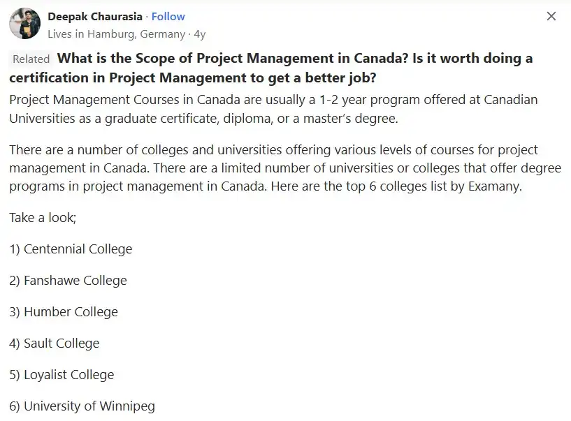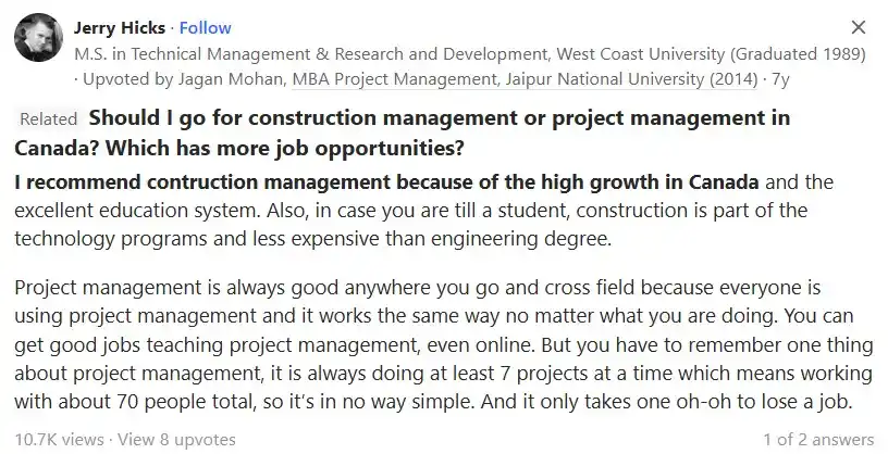 کاربر دیگری به نام Jerry، در پاسخ به این سوال که «در کانادا مدیریت ساختوساز بخوانم یا مدیریت پروژه معمولی؟» گفته است:
