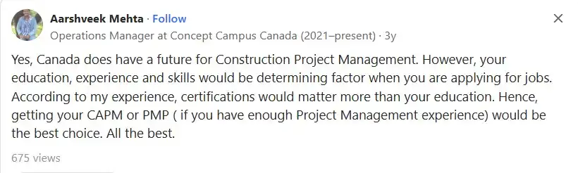 شخصی به نام Deepak نیز درباره ارزش و اهمیت رشته مدیریت ساخت و پروژه در کانادا گفته است:
