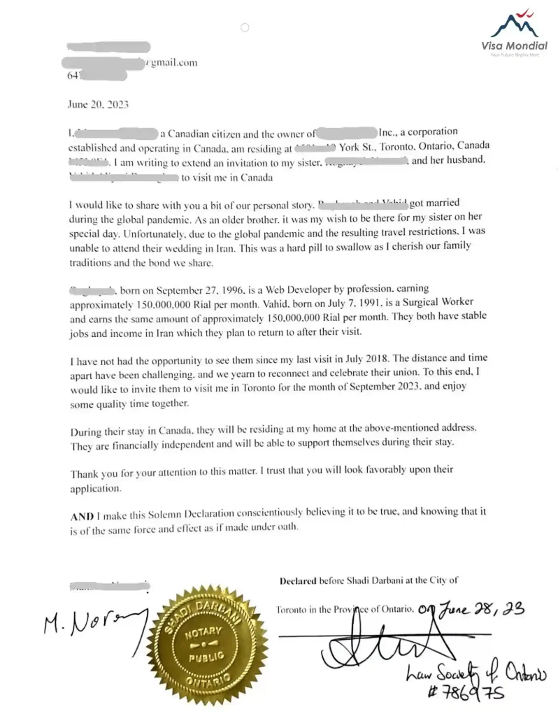 - اگر آفیسر درخواست کرد دعوت نامه را notarized کنید، باید تاییدیهی دعوت نامه را توسط دفاتر رسمی کانادا بگیرید. بعد از آن میتوانید دعوت نامه را بفرستید.