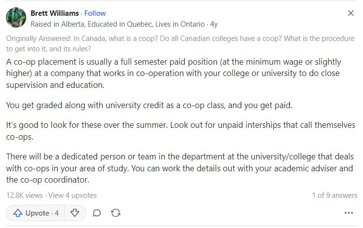 «یک برنامه Co-op معمولا یک ترم کار با حقوق (حداقل دستمزد یا کمی بالاتر) در یک شرکت است که با همکاری کالج یا دانشگاه محل تحصیل شما برای آموزش دقیق کار به دانشجو و نظارت آن برگزار میشود.